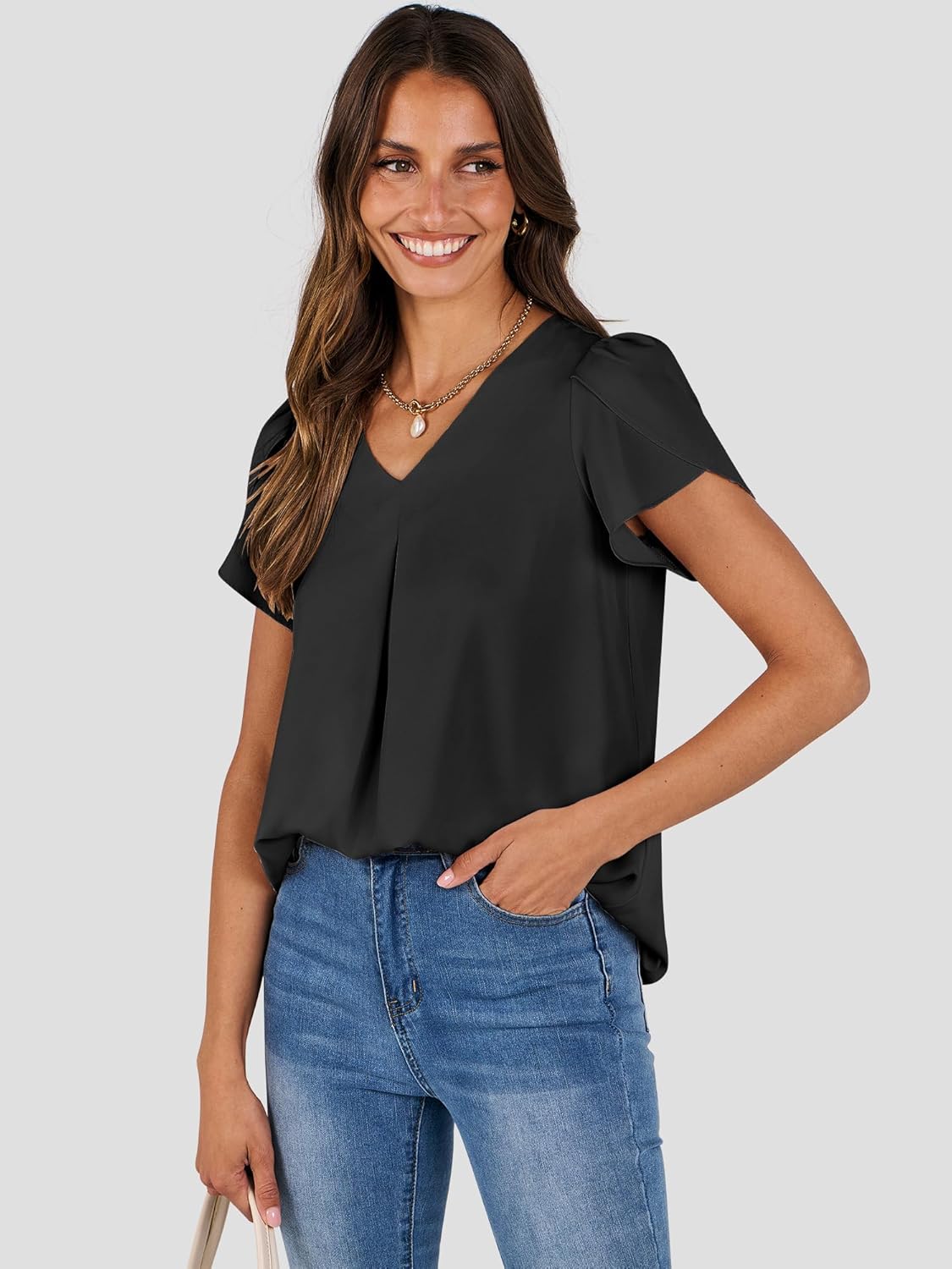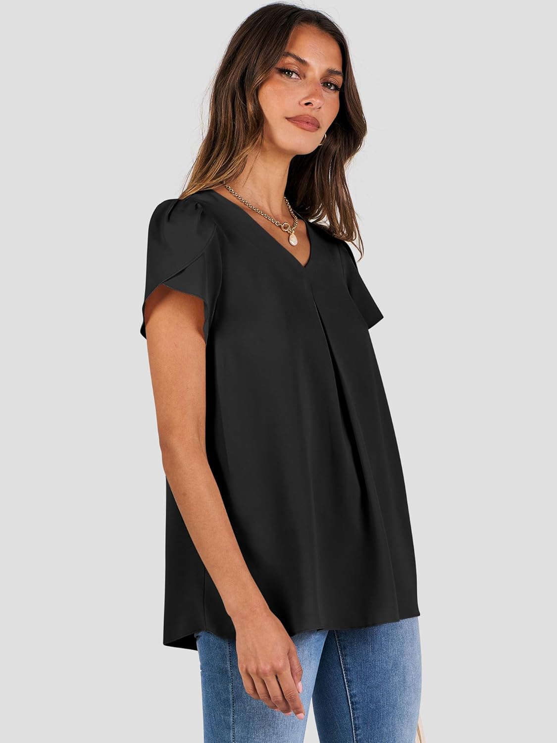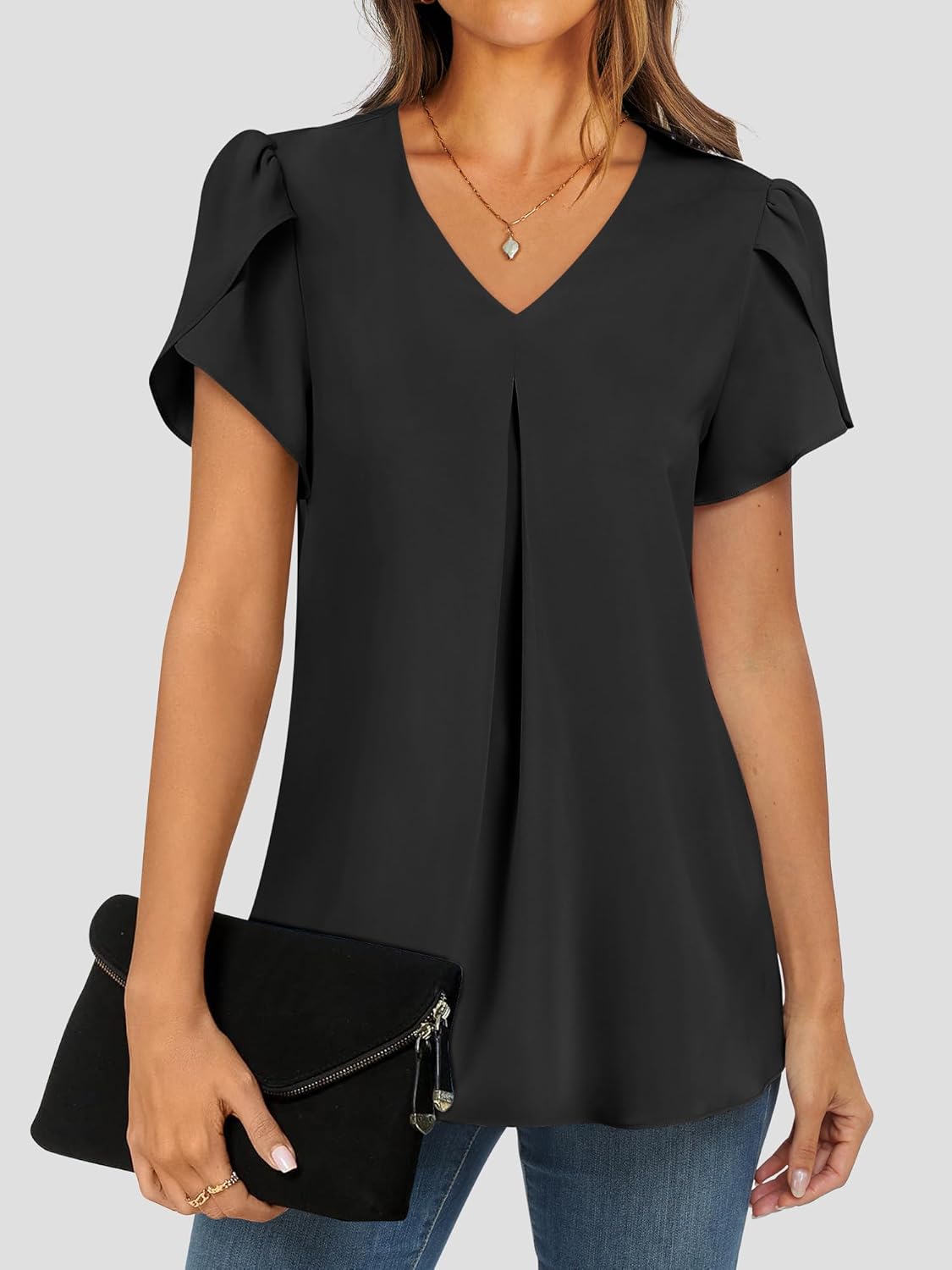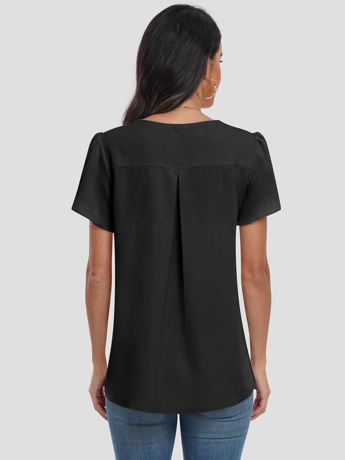 ANRABESS Women’s Summer V Neck Short Sleeve Blouses Dressy Chiffon Shirts Business Casual Tunic Tops for Leggings