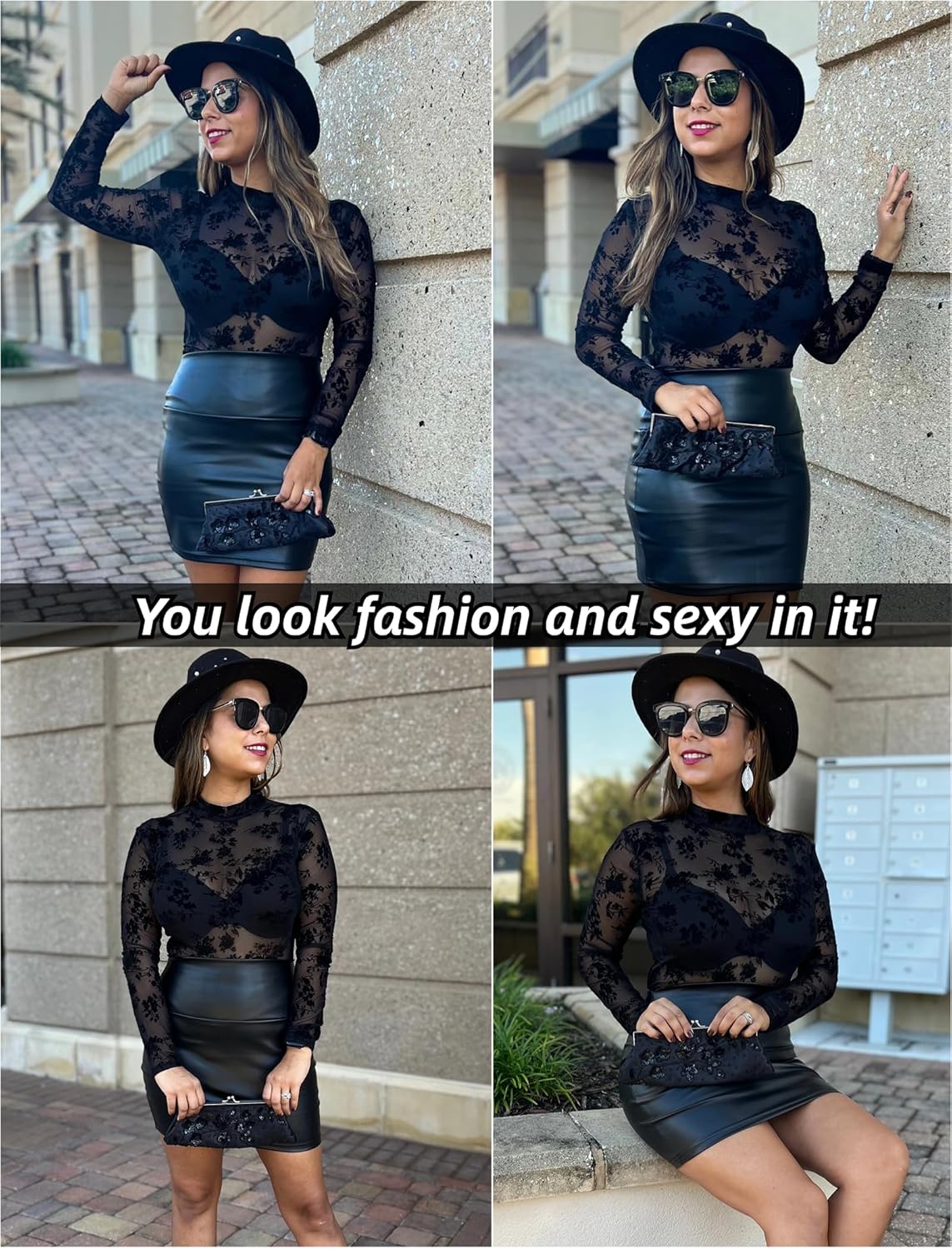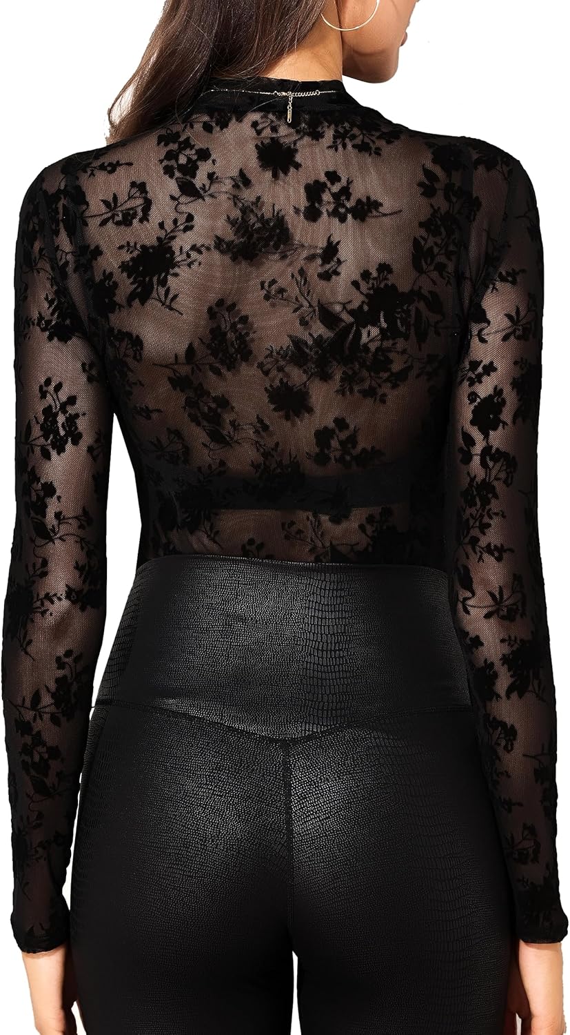 Women Mesh Top Floral Mesh Long Sleeve Tops Mock Neck See Through Tops Fitted Sexy Going Out Tops